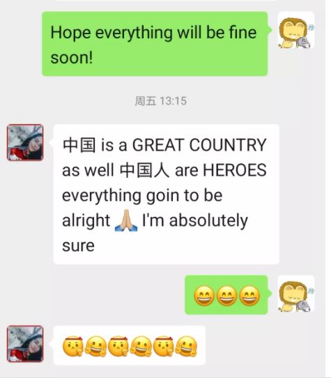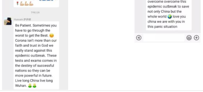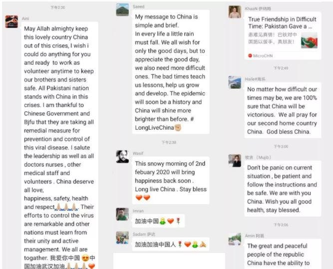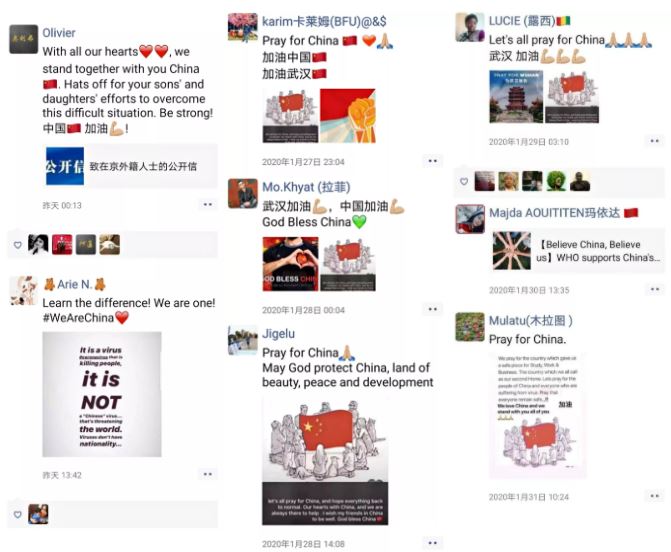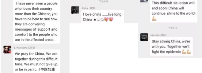"I have never seen anyone who loves their motherland more than the Chinese. You have to be here to see how they convey a message of support and comfort to people in the epidemic area. We are with China, and we also trust the Chinese government's efforts to make the situation better! Go China!"